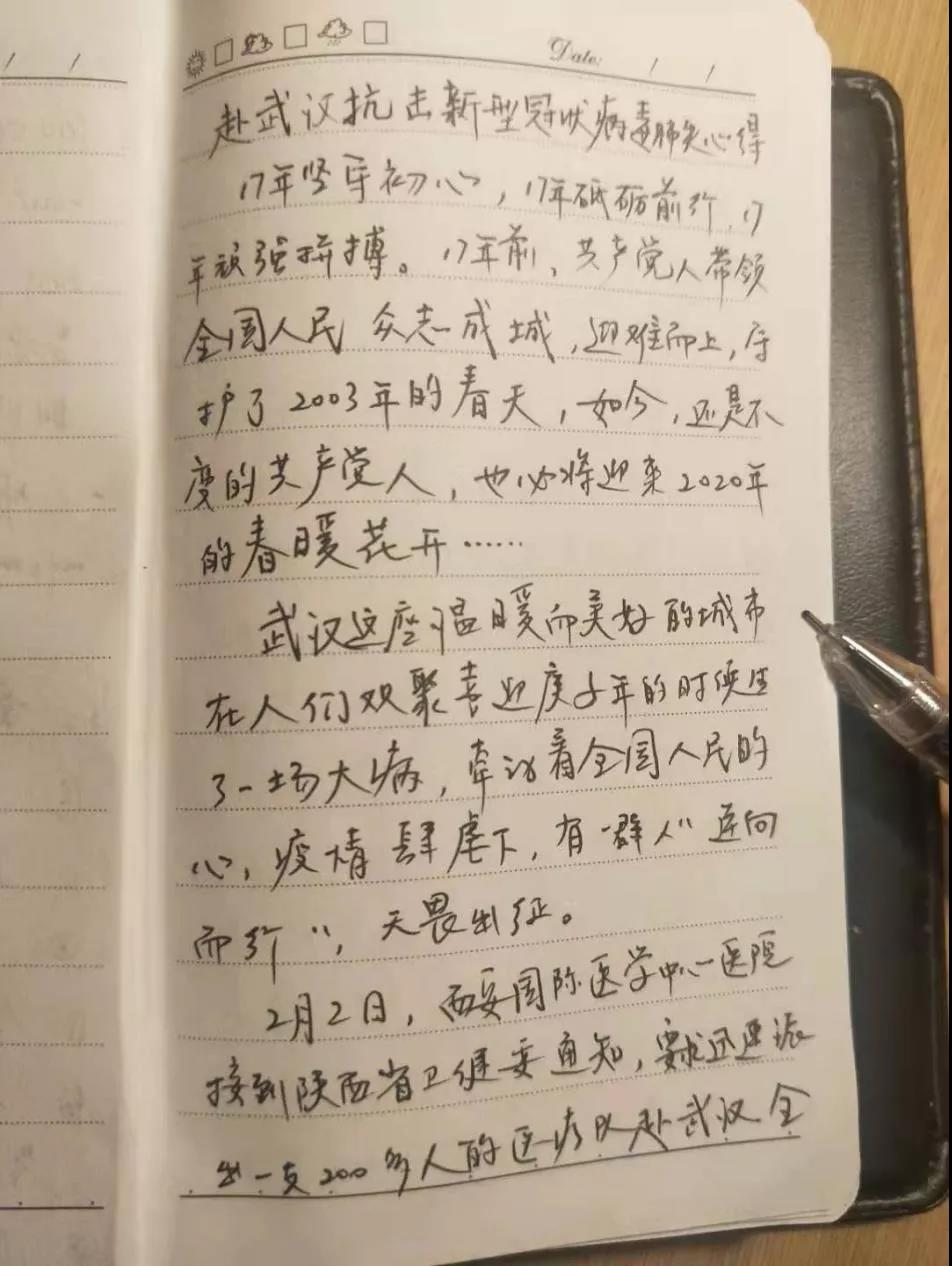 日記的作者李一鳴是西安國(guó)際醫(yī)學(xué)中心醫(yī)院消化內(nèi)科三病區(qū)的主治醫(yī)師,也是赴武漢醫(yī)療隊(duì)成員。提及初心,他在日記中寫(xiě)到,不論是作為一名醫(yī)者、一名黨員還是一名中華人民共和國(guó)公民,他都責(zé)無(wú)旁貸應(yīng)該奔赴抗擊疫情的最前線,于是他在得知將要組織支援武漢的醫(yī)療隊(duì)后第一時(shí)間報(bào)名。