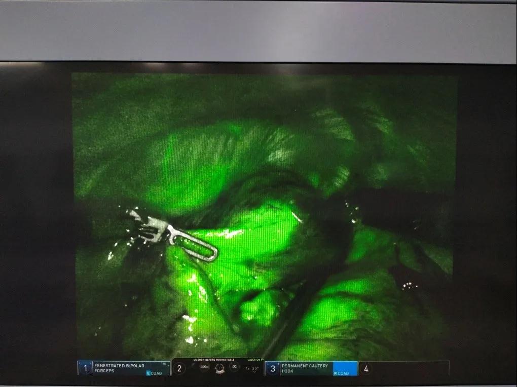 李文海主任坐在操控臺(tái)旁,操作機(jī)器人機(jī)械臂進(jìn)行胸腔內(nèi)探查,解剖肺門(mén)及肺裂,游離并閉合切斷左肺上葉尖后段血管、支氣管,清掃各組淋巴結(jié)。手術(shù)中為更加精準(zhǔn)進(jìn)行肺段切除,術(shù)前對(duì)結(jié)節(jié)及肺段血管進(jìn)行了三維重建,使得術(shù)中解剖血管及支氣管更加精準(zhǔn),術(shù)中應(yīng)用熒光染色劑對(duì)解剖平面進(jìn)行標(biāo)記,最大限度保障了正常肺段的完整及功能。