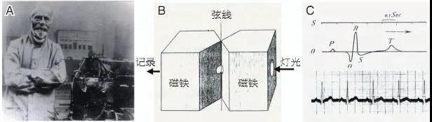 A:Einthoven;B:弦線式心電圖機(jī)模式圖;C:首例弦線式心電圖機(jī)記錄的心電圖