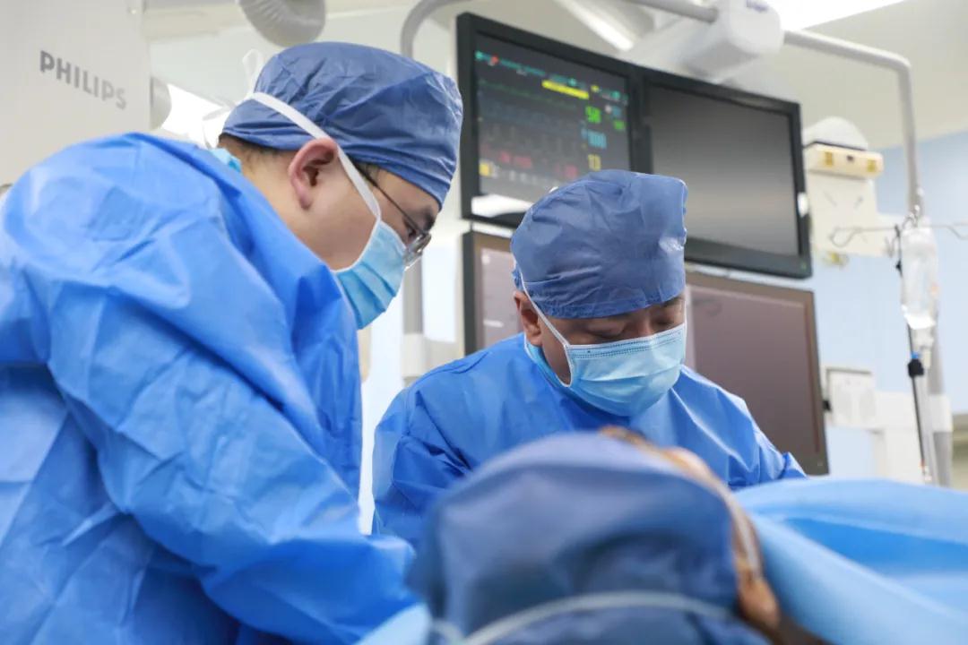 按照術前制定的方案,郭穎強主任和楊金保博士首先嘗試開通閉塞的右腎動脈,但由于血栓機化、鈣化嚴重,右腎動脈難以開通。遂謹慎擴張狹窄的左腎動脈,并成功植入一枚支架。之后經過反復旋磨、抽吸,順利開通髂動脈,但腹主動脈閉塞段仍難以擴通。此時,患者居高不下的血壓很快恢復到正常水平。