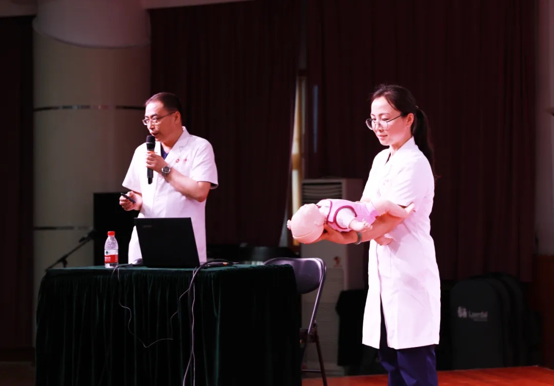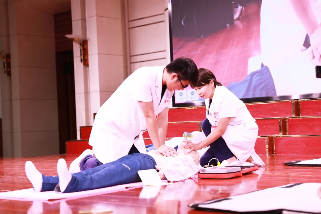 在多功能廳,王彬榮副主任進(jìn)行理論授課;呂玉珠醫(yī)生、張榮榮護(hù)士長、許哈克分別進(jìn)行了成人、兒童、嬰兒心肺復(fù)蘇術(shù)(CPR)模擬演練、體外自動除顫器(AED)的使用、海姆立克法、嬰兒氣道梗阻的緊急處理方法等操作演示,并以互動的方式邀請12名學(xué)生代表上臺進(jìn)行了操作練習(xí),老師們現(xiàn)場進(jìn)行一對一的指導(dǎo),為大家解答各種疑問,使他們對現(xiàn)場心肺復(fù)蘇術(shù)的全過程有了更加深刻的理解,也使學(xué)生們基本掌握了心肺復(fù)蘇法的操作技能。
