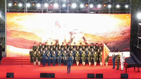 “一二一”,演出開始,由71名退役軍官組成的退役軍人合唱團(tuán),在尹強(qiáng)院長的帶領(lǐng)下,邁著整齊的步伐,喊著響亮的口號(hào),雄赳赳,氣昂昂走上舞臺(tái)。
