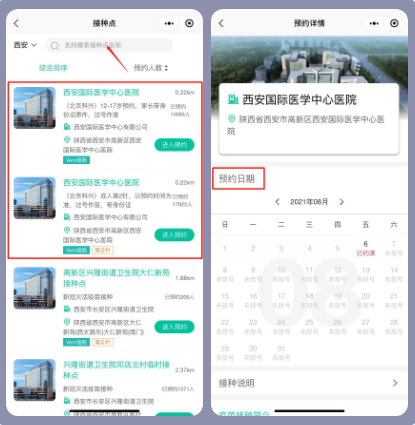 搜索框輸入“西安國(guó)際醫(yī)學(xué)中心醫(yī)院”,點(diǎn)擊【進(jìn)入預(yù)約】,選擇疫苗【可預(yù)約】日期、時(shí)間段。