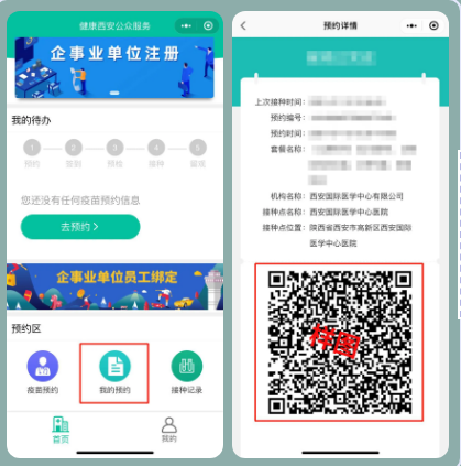 返回【首頁(yè)】,點(diǎn)擊【我的預(yù)約】,憑【二維碼】掃描來院完成疫苗接種。根據(jù)預(yù)約時(shí)間,來我院A樓一樓(藍(lán)色樓)進(jìn)行疫苗接種。