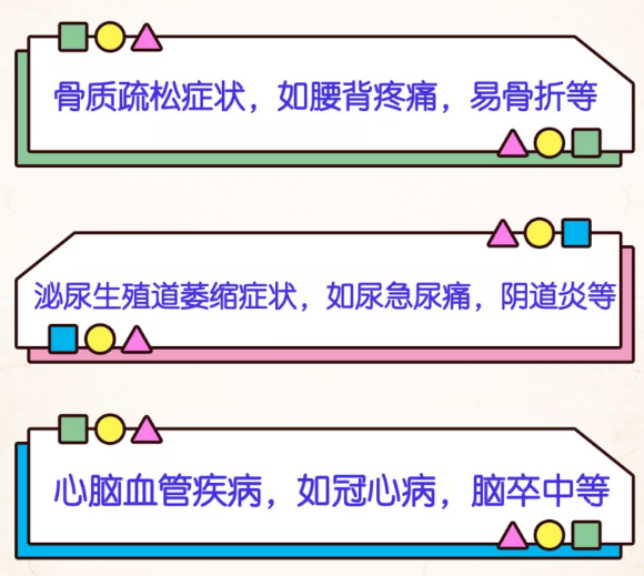 實(shí)際上,除了近期危害,因缺乏雌激素會(huì)帶來遠(yuǎn)期危害,嚴(yán)重影響女性的健康和生活質(zhì)量,比如:
