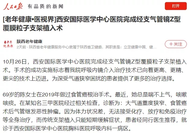 [老年健康?醫(yī)視界]西安國(guó)際醫(yī)學(xué)中心醫(yī)院完成經(jīng)支氣管鏡Z型覆膜粒子支架植入術(shù)