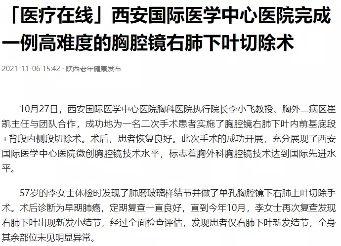 「醫(yī)療在線」西安國(guó)際醫(yī)學(xué)中心醫(yī)院完成一例高難度的胸腔鏡右肺下葉切除術(shù)