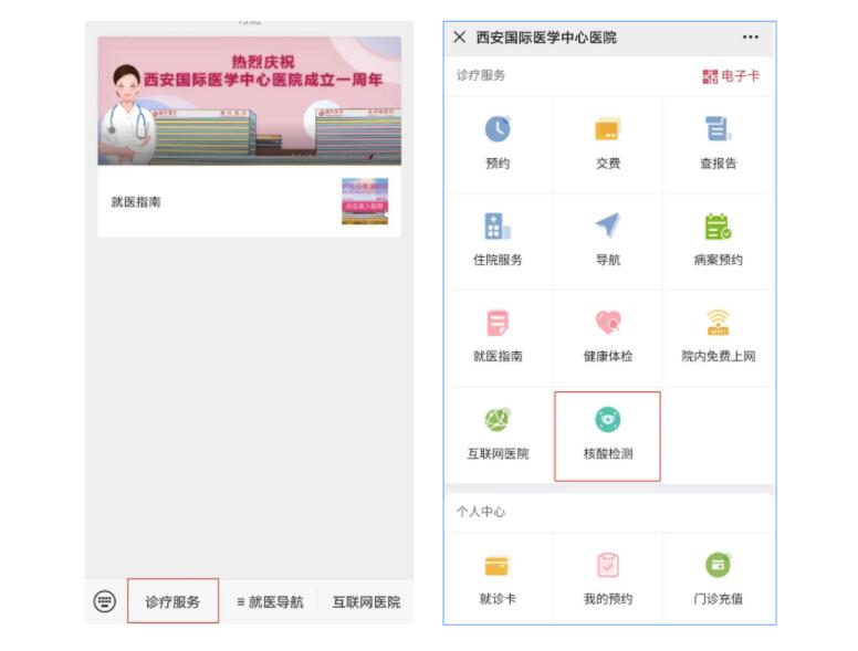 醫(yī)院核酸檢測已開通線上預(yù)約,大家可通過“西安國際醫(yī)學(xué)中心醫(yī)院服務(wù)號”微信公眾號進(jìn)行預(yù)約。