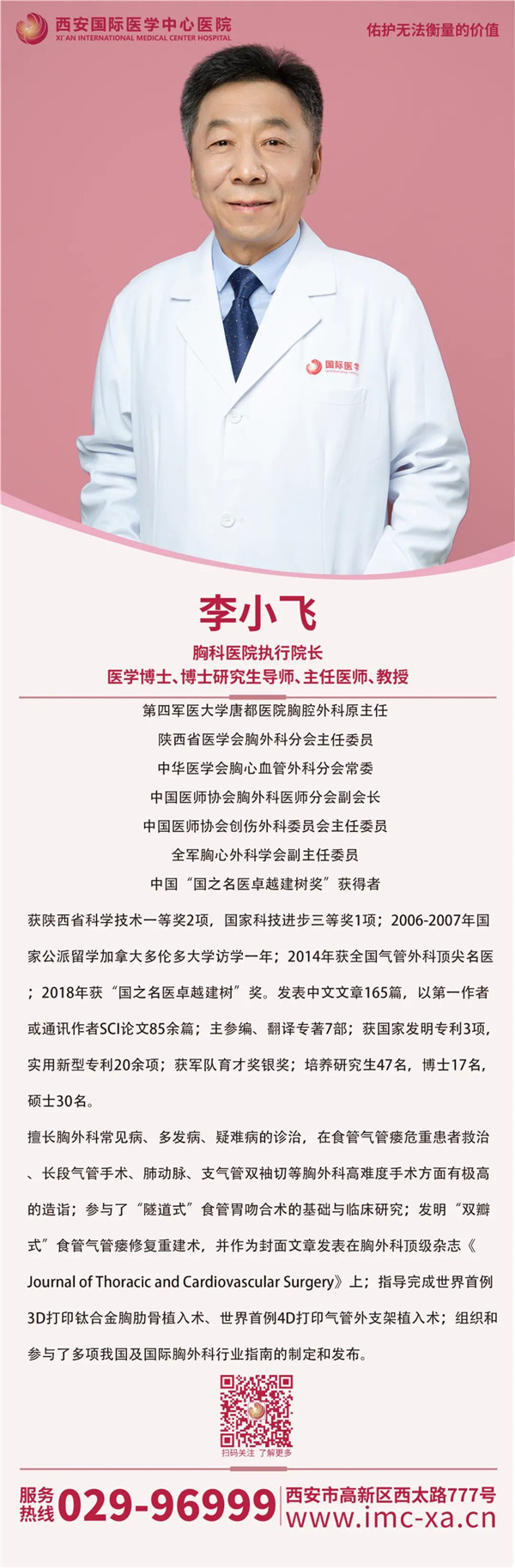 2021年11月,李小飛來(lái)到西安國(guó)際醫(yī)學(xué)中心醫(yī)院任胸科醫(yī)院執(zhí)行院長(zhǎng)。李小飛兢兢業(yè)業(yè)、忘我工作,只為患者重返健康,感受生命的美好;勇于創(chuàng)新、不辭辛勞,只為攻克醫(yī)學(xué)難題而前行;醫(yī)者仁心、大志于胸,為更多的患者保駕護(hù)航,為他們帶來(lái)重生和希望。
