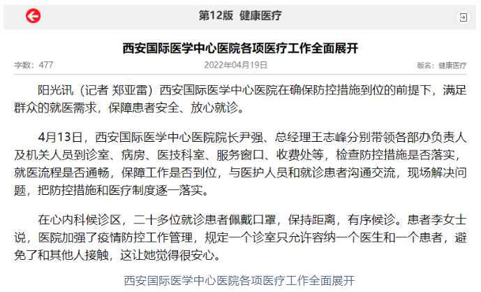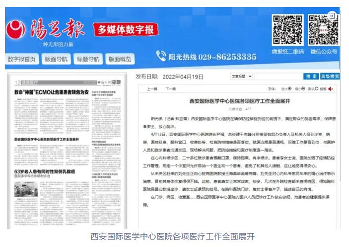 陽光報:西安國際醫(yī)學(xué)中心醫(yī)院各項醫(yī)療工作全面展開
