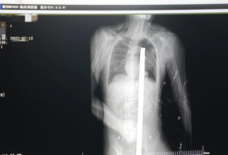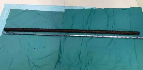 情況緊急!術(shù)中探查后發(fā)現(xiàn),長120cm直徑3cm的螺紋鋼經(jīng)患者右側(cè)會陰部穿入,傷及直腸,途徑膀胱后方,左側(cè)髂總動靜脈之間傷及左腎后,經(jīng)胰腺后方在肝脾之間穿破膈肌,在下肺靜脈前方穿入左肺穿破氣管及左右主支氣管膜部,止于主動脈弓下水平,穿入體內(nèi)的部分達(dá)到75cm。