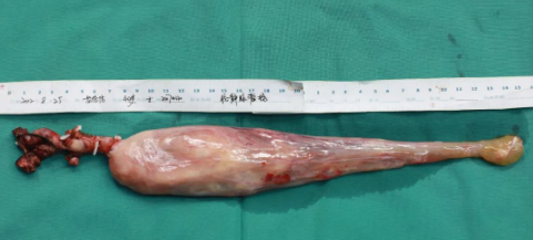 手術(shù)刀游走在人體血管的江河湖海,在完全游離肝臟顯露全段下腔靜脈后,依次有序阻閉“主干道”的血流供應(yīng),最后阻斷肝臟血供,于肝臟尾狀葉肝短靜脈下方切開下腔靜脈,借助經(jīng)食管超聲實時嚴密的監(jiān)控,經(jīng)下腔靜脈切口順利取出位于右心房、膈上下腔靜脈、肝后下腔靜脈內(nèi)的瘤栓,隨即阻閉膈下腔靜脈,同時恢復(fù)肝臟血流“通航”。手術(shù)刀繼續(xù)向下行進,一點一點地剝離下腔靜脈遠心段直至右側(cè)髂總靜脈、右側(cè)髂內(nèi)靜脈內(nèi)的瘤栓,最終,一根長達35cm、最寬直徑5cm的腔靜脈瘤栓被完整取出!