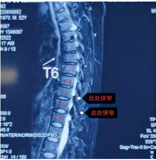 患者劉先生(化名)多年前就被確診為強(qiáng)直性脊柱炎,雖有間歇性治療,但胸椎、頸椎、腰椎等多節(jié)段都有椎管狹窄,尤其是胸9—10和10—11兩個(gè)節(jié)段,骨化的黃韌帶和脊髓的硬膜幾乎完全粘連在一起,脊髓壓迫嚴(yán)重。受此影響,劉先生兩條腿沉重、走路沒(méi)有力量,需要人攙扶著才能走,且大小便也控制得不好,才52歲的他,生活已完全不能自理。