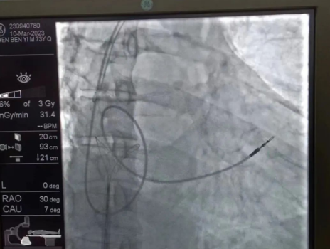 術(shù)中,孫書紅醫(yī)師首先切開起搏器囊袋,游離出起搏器脈沖發(fā)生器,發(fā)現(xiàn)起搏電極完全斷裂,連接于起搏脈沖發(fā)生器,殘端約10cm;考慮患者為起搏依賴患者,需再次植入新的起搏電極導(dǎo)線,穿刺了腋靜脈,放置導(dǎo)絲;同時(shí),李偉杰教授穿刺了左、右股靜脈,于右股靜脈置入了”抓捕器”,左股靜脈備用臨時(shí)起搏通路,以防術(shù)中出現(xiàn)心跳驟停。為了準(zhǔn)確抓捕到心房?jī)?nèi)的在逃起搏電極,李偉杰教授將導(dǎo)管室的X光機(jī)球管調(diào)整成了冠脈模式,這就意味著在抓捕過程中,醫(yī)生要比平時(shí)的手術(shù)“吃”更多射線……