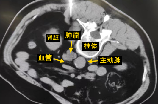 經(jīng)過多學(xué)科討論,陳寶瑩主任根據(jù)影像資料指出,患者轉(zhuǎn)移瘤位于腹膜后,內(nèi)側(cè)瀕臨人體最大的血管——主動脈;前方同樣有血管緊貼腫瘤;外側(cè)是腎臟,后方是椎體和神經(jīng),夾縫中進(jìn)針難度大,治療時(shí)要避免周圍重要臟器、血管和神經(jīng)的損傷,因此可以選擇CT引導(dǎo)下精準(zhǔn)穿刺活檢同步冷凍消融治療,即獲得病理組織有利于下一步全身治療方案的調(diào)整,同時(shí)殺死腹膜后轉(zhuǎn)移瘤,周圍正常組織損傷的可能性也小。