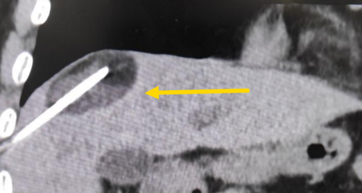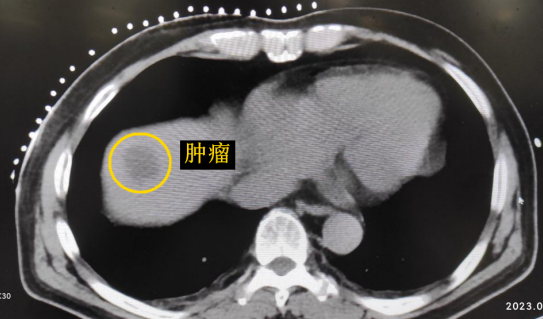 患者老年男性,曾于2021年行結(jié)腸癌手術(shù)。幾月前,發(fā)現(xiàn)肝臟轉(zhuǎn)移瘤,但沒有干預(yù)。近期CT顯示該轉(zhuǎn)移瘤明顯增大,并發(fā)現(xiàn)另一處轉(zhuǎn)移灶。