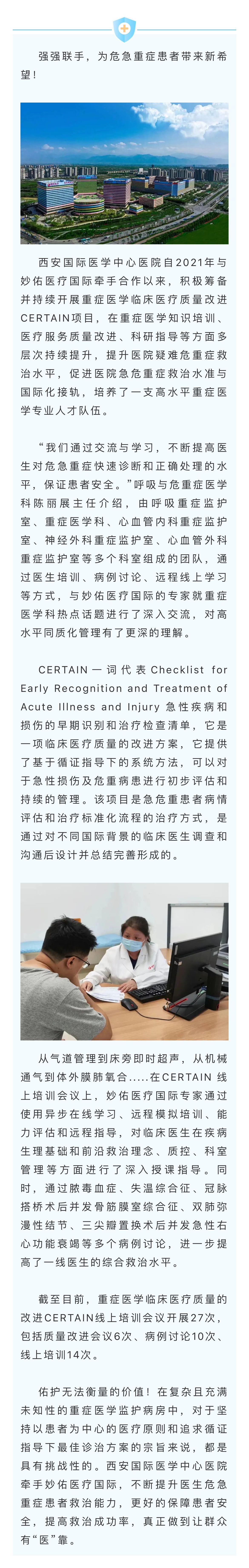 • 國內(nèi)首家高分通過JCI認證的醫(yī)院 西安國際醫(yī)學(xué)中心醫(yī)院為國內(nèi)首家高分通過JCI認證的醫(yī)院,該稱號由國際醫(yī)療機構(gòu)認證聯(lián)合委員會頒布。